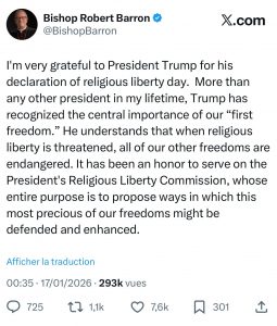 Mgr Robert Barron, évêque de Winona-Rochester, a ainsi remercié le président américain Donald Trump pour avoir proclamé le 16 janvier journée dédiée à la liberté religieuse.